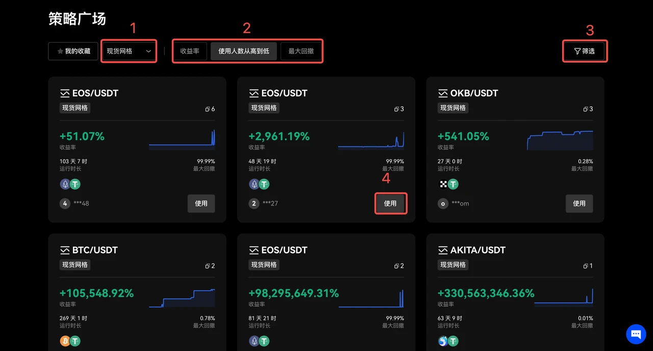 您也可以一键复制高手策略参数。在策略广场,选择策略类型和筛选条件,在结果中选择要复制参数的高手策略,点击【使用】,在对话框中选择【使用该策略】,即可一键复制高手策略参数到手动交易页面,填入金额即可创建策略。