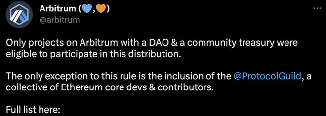 据Arbitrum 官方推文,对生态中DAO 组织空投的核心原则是能真正支持Arbitrum 的子社区,并且只有Arbitrum 上具有DAO 组织结构及社区金库的项目,才有资格参与本轮分发: