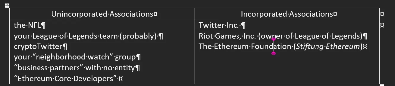 因此,一个 DAO 是由个人组成的某种共同目标或以规律方式相互交互的协会。对于那些学习公司法的人来说,我们知道协会有两种主要类型:非法人和公司。