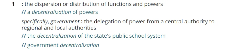 “去中心化”比“组织”更难定义,但相差不大。Webster 在相关部分对“去中心化”的定义如下: