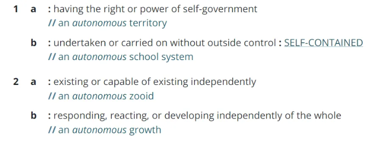 所以,那么“自治”真正意味着什么?好吧,Webster 的定义非常正确: