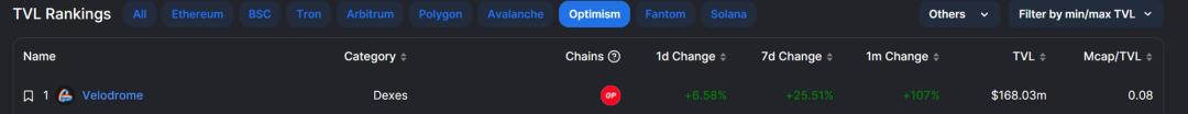 自去年 8 月 Velodrome 推出 op tmxcn 激励措施,TVL 随之暴涨,超越 Uniswap 和 Curve,并在之后的日子里长期霸榜 OP TVL 第一。从 Defillama 的数据来看,Velodrome 目前的 TVL 约为$168 m,占 OP 全链的 21.6%,无疑是 OP 上最值得关注的项目之一。