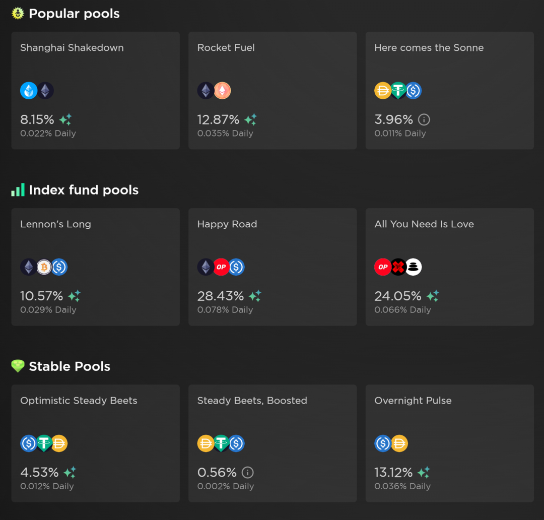 由于 OP 是 EVM 兼容链,一些以太坊上的龙头项目能平滑地迁移过来,所以 Uniswap V3,Curve,KyperSwap 这些大项目在 OP 上也有部署,习惯了使用这些的朋友也可以保持原来的使用偏好。