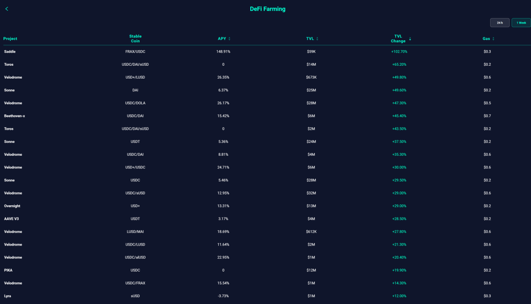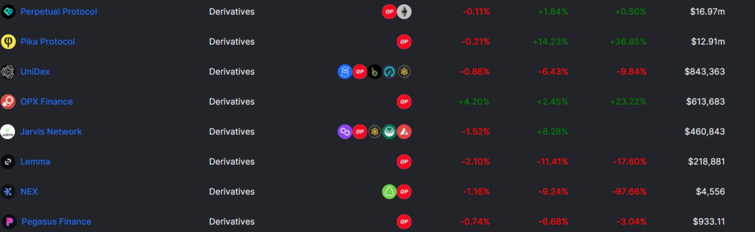 2.1 DeFiDeFi 永远是公链的重头戏,DeFi 项目的繁荣、创新会吸引、容纳大量的流动性,就像给发动机注入燃油一样,盘活整个公链生态。OP 的 DeFi 生态比较完善,去中心化交易所、借贷等一应俱全。