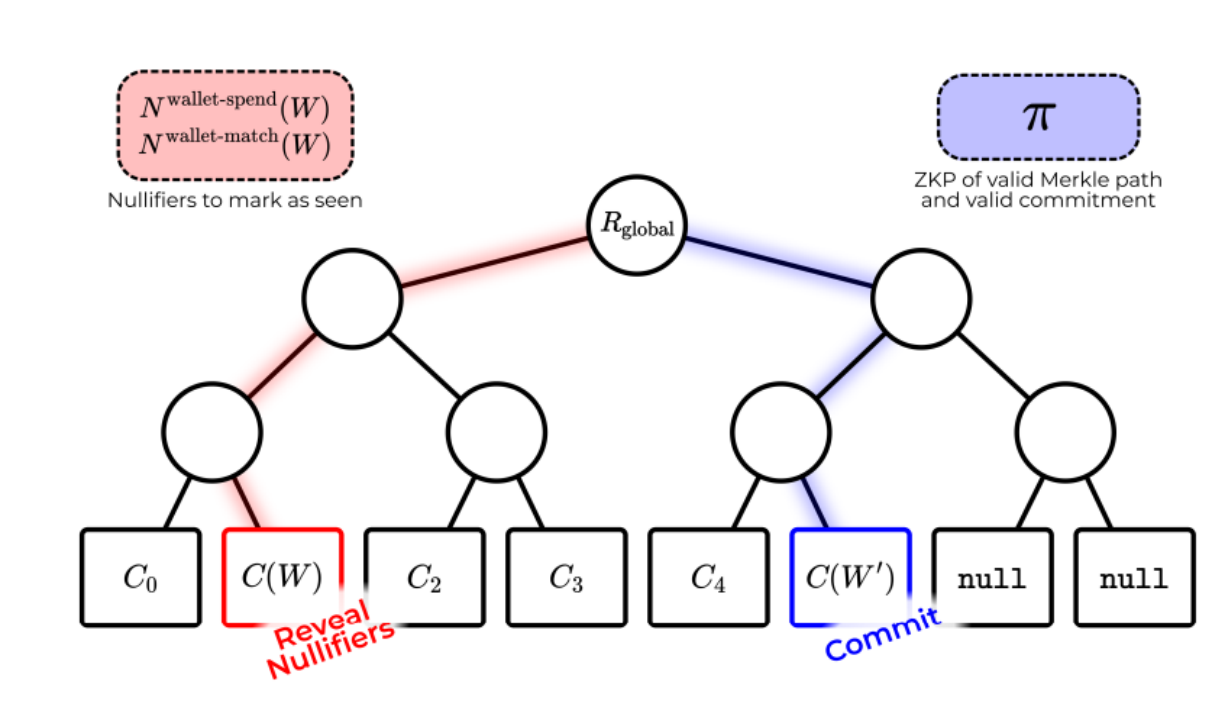 智能合约维护着一个包含所有先前承诺的全局 Merkle 树,以及一组用于显示先前钱包的无效符。