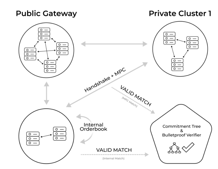 从根本上说,Renegade 只是由许多独立中继器组成的 p2p 沟通网络组成,这些中继器在新订单进入系统时不断地交流并相互执行 MPC。中继者从不保管资产,只是被授予查看钱包的权限以计算成对的 MPC。