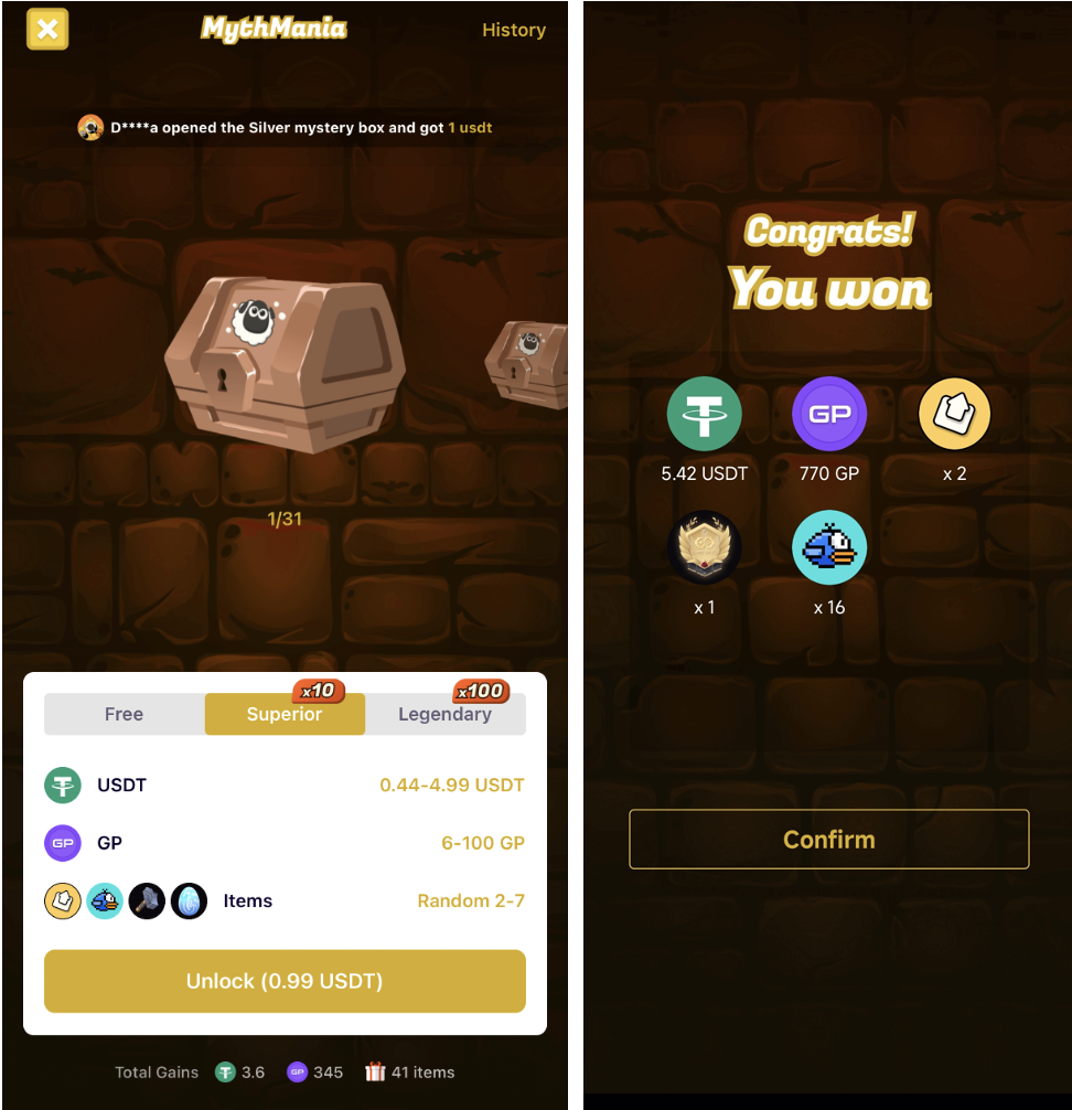 积木效应在Game Space的Casual GameFi中体现得淋漓尽致:通过推出一系列的Casual GameFi形成矩阵,每个Casual GameFi都有一套独立的产出消耗场景,同时游戏中产出的USDT、游戏道具、NFT与Game Points (GP) 等互通与转换形成了有效叠加,所获得的资产随时可以用来玩别的游戏,例如《Goat! Goat!》 中获得的盲盒可以在《MythMania》中使用,《MythMania》开出的Merge Bird NFT又可以在《Merge Bird》中使用。