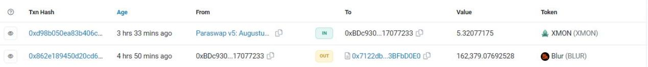 简单分析来看,SUDO初始流动性不太可能在3月初之前部署(也就是说3月前SUDO不太可能在交易所上线),这也是现阶段不少交易者把目光投向BLUR的原因。不过下一波加密市场注意力很可能会转移到SUDO上,链上数据显示已经有人开始探索SUDO的潜力,比如下图中的巨鲸已将162,379枚BLUR全部兑换成了XMON。