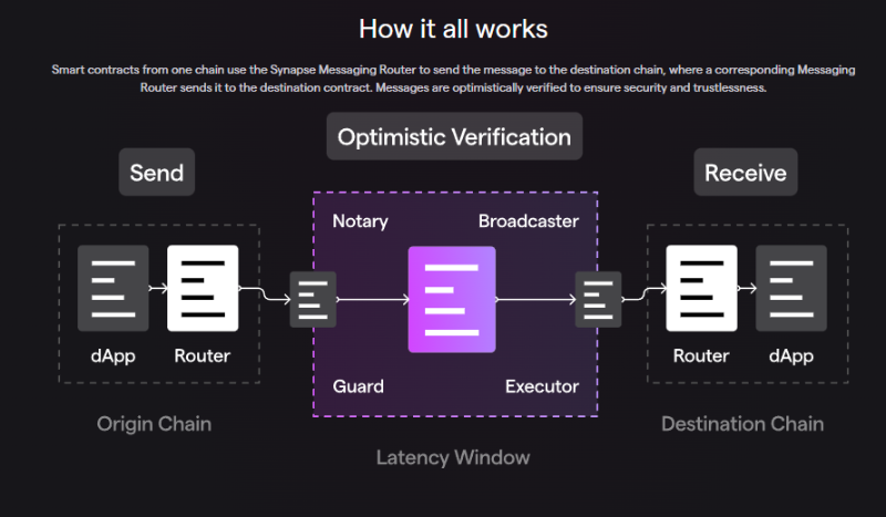 Synapse 使用 Optimistic 安全模型来确保跨链消息的完整性,如果检测到恶意状态,“守护者”会观察跨链消息并提交欺诈证明。