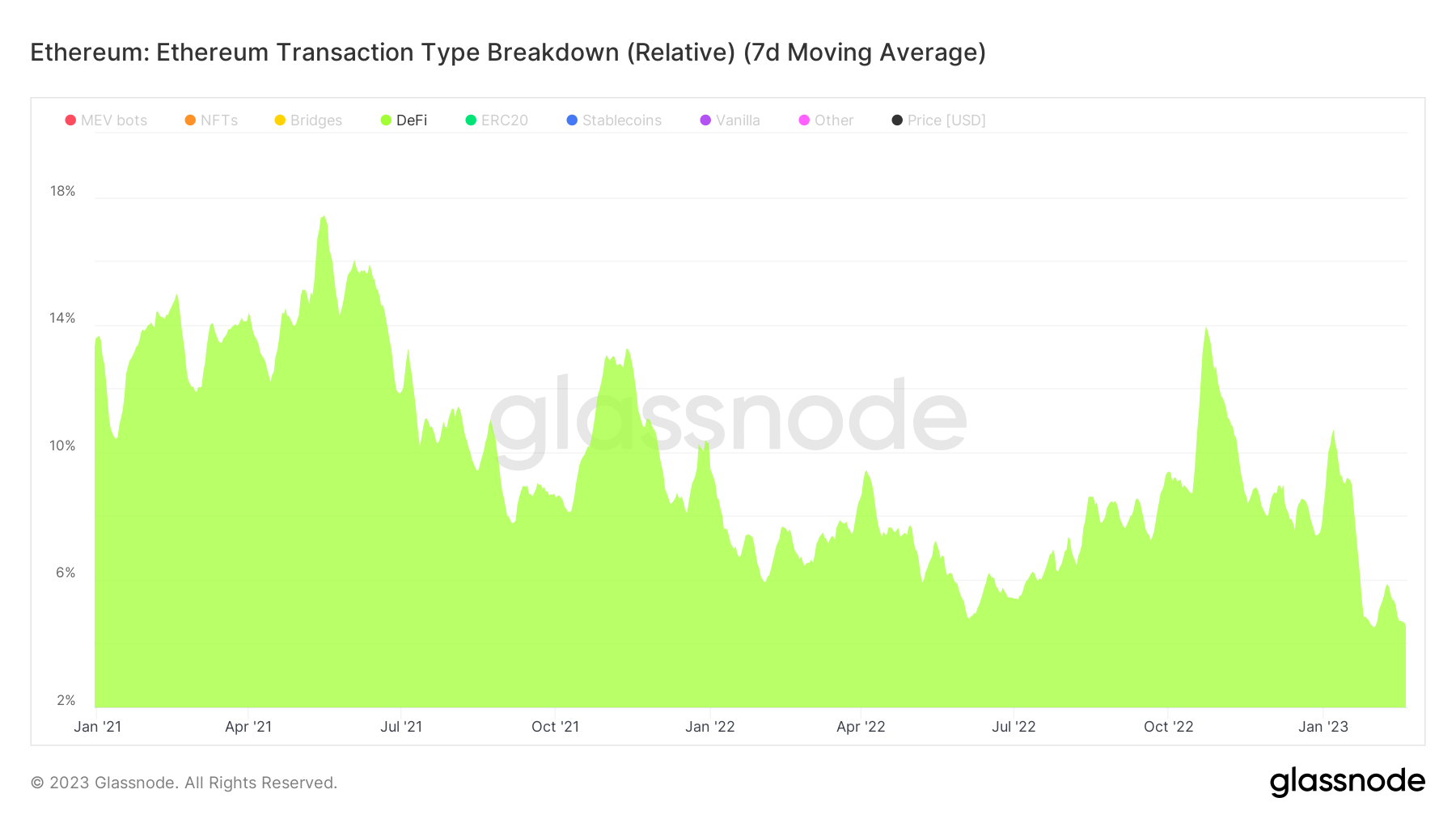 根据glassnode的数据,从绝对变化上来看,2月18日,以太坊上DeFi类的交易次数(7天均值)约为4.12万次,为2021年以来的最低水平,较今年1月4日创下的短期高点12.44万次下降了66.84%,跌幅明显。从相对变化上看,近期DeFi类交易次数也同样处于低位。2月14日,以太坊上DeFi类的交易次数占比(7天均值)约为3.96%,为2021年以来极低水平,并且此后都维持在4.6%左右,最高不超过5.2%,与此前2年平均占比近10%的水平大相径庭。