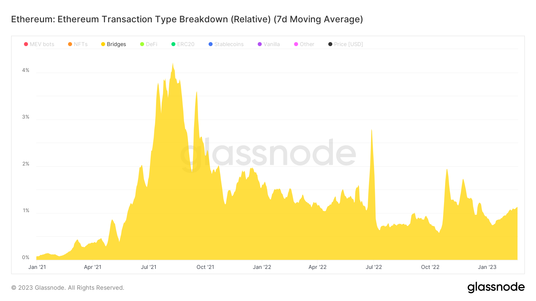 根据统计,2月19日,Bridges的交易次数(7天均值)约为1.33万次,占比约为1.33%,两个数据均为今年最高。受到近期多个Layer2网络的利好消息影响,包括Arbitrum的生态发展和zkSync主网更新,未来,Bridges的交易次数还有可能保持增长态势,同时,这对底层网络的交易结构也会产生持续影响。