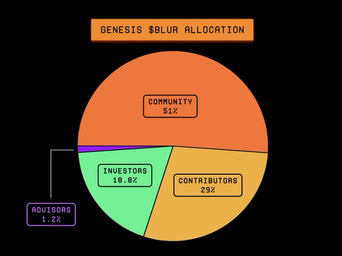 03、代币分配随着 $Blur 代币的发行,我认为该项目是将协议价值分配的权力转移到社区的最成功的项目之一。$Blur 最初流通供应的 3.6 亿代币 (供应量的 12%) 被分配给了社区,那么其余的呢?