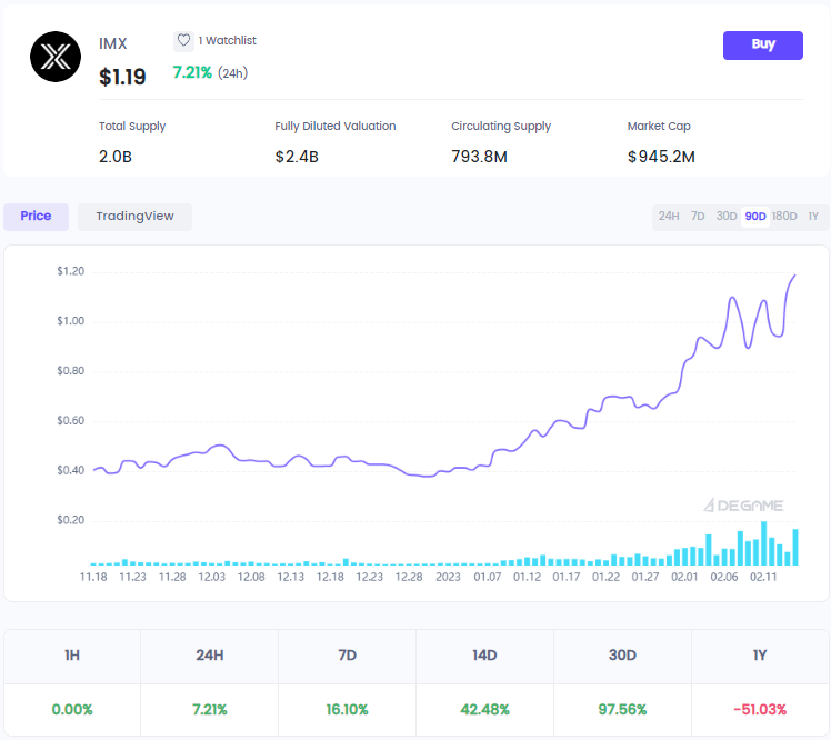 而因游戏而生的Immutable X,拥有越来越多的游戏项目布局于此,IMX明显有着更多的机会去操作一番,但凡这其中的一款游戏成为2023年的小Axie或者小跑鞋,那么IMX的发展将会变得更加瞩目更有吸引力。