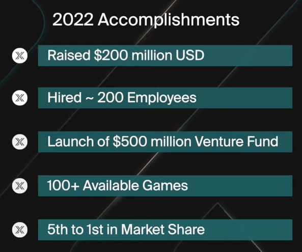 2022年获得2亿资金后,Immutable展开了发展扩张,在全球各大公司裁员的大背景下,Immutable招聘多了200名员工,另于6月启动5亿风投基金,以促进 Web3 游戏发展,Immutable X上的游戏已超过100款,市场竞争份额已可达前5。