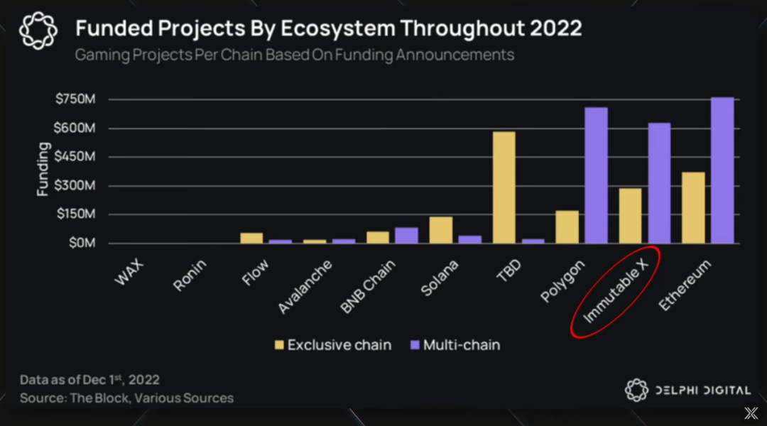 据Delphi Digital的报告显示,Immutable X上的游戏超过100款,于2022年共筹集了9亿资金,其中Immutable X上的独家游戏获得了3亿美元资金投资,基于Immutable X的多链游戏则有6亿美元。