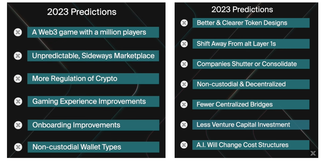 Immutable 创始人Alex Connolly与Robbie Ferguson在年初的时候曾对2023年进行简单预测,其中提到了热点话题A.I.,不知道身为CTO首席技术的Alex Connolly是否会将A.I.相关技术引入IMX,这点也是可以稍微留意一下。
