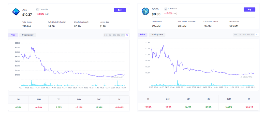 发展到现在,虽然热度都已经大不如前,但Axie Infinity的AXS FDV仍高达28亿,市值12亿,而Gods Unchained的GODS FDV仅有1亿5千万,市值6千万,两款游戏早已经不在一个层面上。