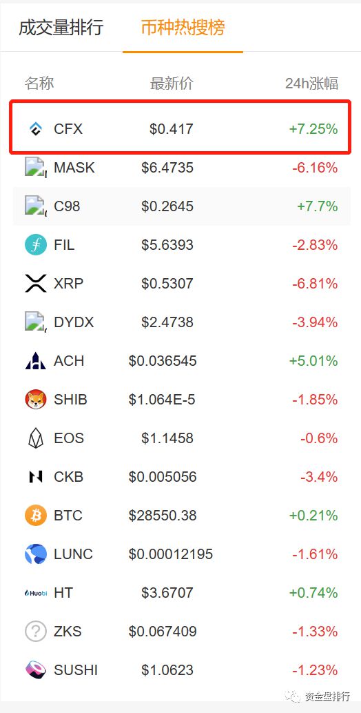根据币安和mytmxcn的数据显示24小时热门搜索币种,把大饼和姨太排开,排在前面五个的分别第一是cfx、第二是MASK、第三是C98、第四是fil、第五是XRP。