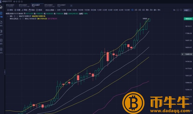 从日线来看,比特币已经连续五年上涨,在大行情中一直稳中有升。10月份以来,市场一直在上涨,这是比特币区块链技术近年来持续时间最长的牛市。对比的最高峰已经涨到2万多美元了。这个时候这个趋势今年肯定会涨到2万,而且会破一个新高的节奏。有朋友问我可以看空空?我的回答是,牛市会一直延续到20000美元之后。照这个趋势,到月底基本能达到2万元。我把我的观点留在这里,让时间来证明。目前从四小时线来看,比特币已经突破布林带运行于上轨,MACD成金叉运行绿色动能柱,小时线显示行情仍处于布林带且一直在破新高,且成交量多头排列,MACD变向上平行。综合分析上,此时上方阻力可以看到19000,这个我在昨晚的直播中已经说过了。下方支撑暂时看18500点。建议回踩做多。