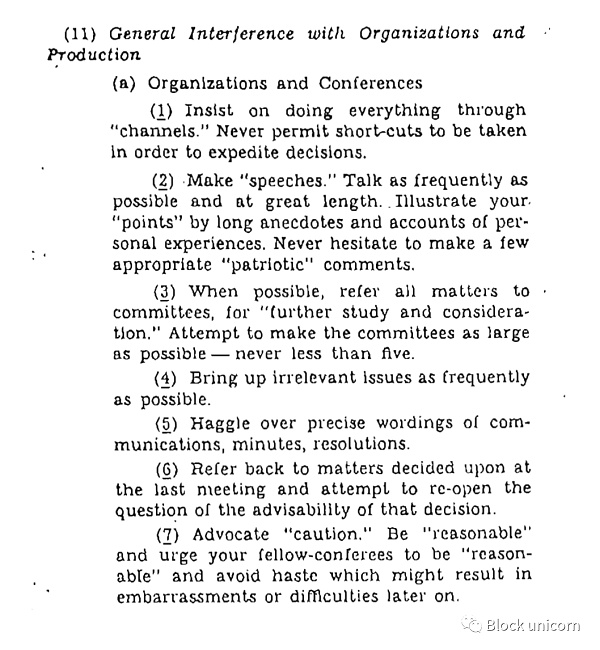 CIA(美国中情局)整理了一本引人入胜的手册,名为《简易破坏现场手册》。除了关于点火、瞄准仓库、摧毁工具和堵塞厕所的详细提示和技巧,手册还包括一个关于破坏组织工作的完整章节。本手册描述了领导不明确、缺乏行动偏向的组织的失败状态: