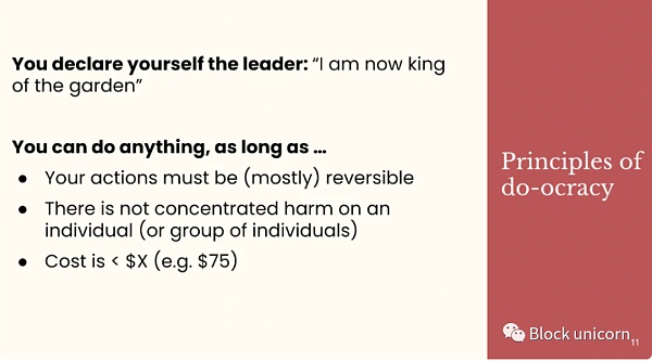 目标是通过授权个人采取自主行动来最大限度地减少治理和共识决策,只要这些行动是可逆的且成本低廉。这种去中心化领导的另一个很好的例子来自Build Weeks of Cabin(线下小屋客厅空由以建设去中心化城市为使命的创作者打造)。