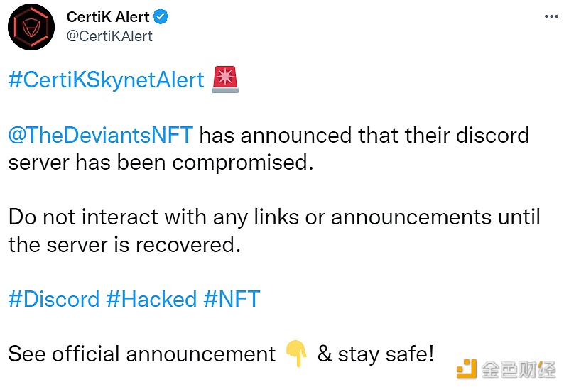 据CertiK监测,Deviants项目Discord服务器遭到攻击。请社区用户在服务器修复之前不要点击任何链接或声明消息。