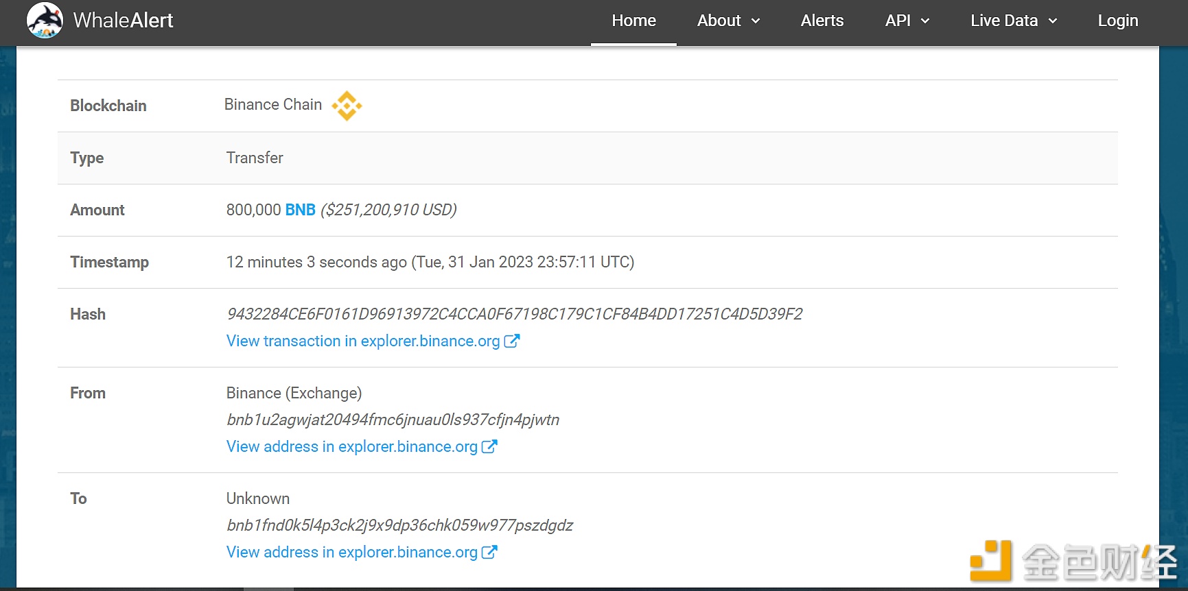 @whale_alert监测数据显示,80万枚BNB从币安交易所转入未知钱包。