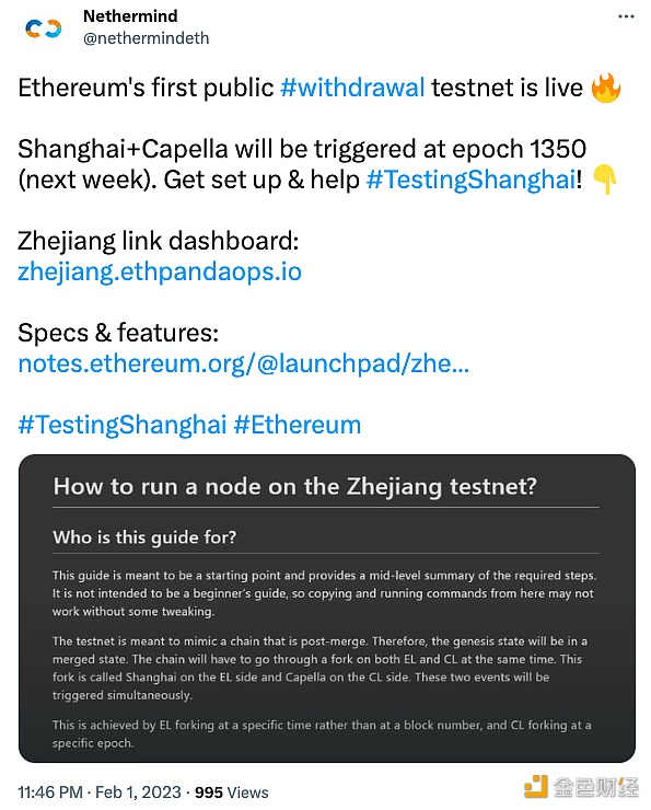 2月2日消息,据以太坊客户端开发商Nethermind消息,以太坊首个公共提款测试网Zhejiang已正式启动,预计下周(epoch 1350)将对该测试网进行Shanghai+Capella升级。